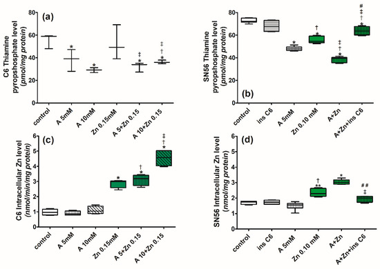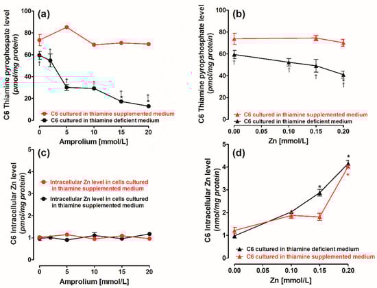 The control intracellular Zn level in C6 cells was equal to 0.98 nmol/mg protein (Figure 1c,d). The addition of amprolium did not affect the Zn level (Figure 1c). To accumulate 3.0 nmol/mg protein of Zn, C6 cells required the addition of 0.15 mmol/L of this cation to the cell culture (Figure 1d) [5].