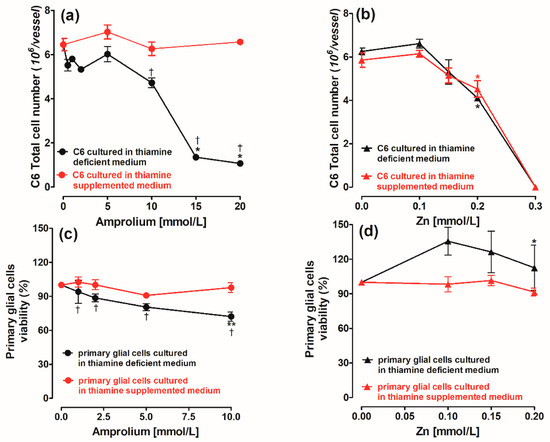 Concentration-dependent, chronic effects of (a) amprolium and (b) Zn on viability of C6 cells. Chronic effects of (c) amprolium and (d) Zn on viability of primary glial cells cultured in thiamine-deficient and thiamine-supplemented medium. Data are means ± SEM from n = 3–4 independent cell culture preparations. Significantly different from respective controls: ** p < 0.01, * p < 0.05; thiamine-supplemented medium † p < 0.01.