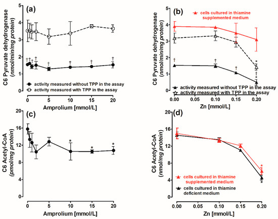 Concentration-dependent chronic effects of (a) amprolium and (b) Zn on PDH activity in C6 cells cultured in thiamine-deficient or -supplemented medium and assayed in the presence or absence of TPP in the assay medium. Chronic effects of (c) amprolium and (d) Zn on acetyl-CoA level in C6 cells cultured in thiamine-deficient or thiamine-supplemented medium. Data are means ± SEM from n = 3–4 independent cell culture preparations. Significantly different from respective controls: * p < 0.01; PDH activity in TPP containing assay medium † p < 0.01.