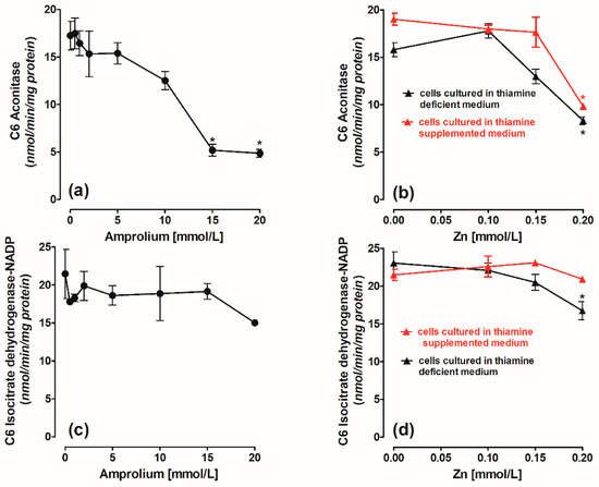 Concentration-dependent chronic effects of (a) amprolium and (b) Zn on aconitase activity. Chronic effects of (c) amprolium and (d) Zn on isocitrate dehydrogenase-NADP (ICDH-NADP) activity in C6 cells cultured in thiamine-deficient or thiamine-supplemented medium. Data are means ± SEM from n = 3–4 independent cell culture preparations. Significantly different from respective controls: * p < 0.01.