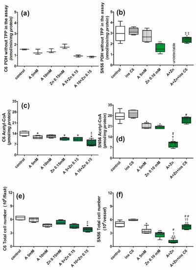 Chronic effects of amprolium and Zn on (a) PDH activity, (c) acetyl-CoA level, (e) total count of C6 cells cultured in thiamine-deficient medium. PDH was assayed in TPP-free assay medium. Chronic effects of amprolium, Zn, and inserts with C6 cells on (b) PDH activity, (d) total acetyl-CoA level, and (f) count of SN56 cells cultured in thiamine-deficient medium. Data are median ± Whiskers: Min to Max from n = 4–6 independent cell culture preparations. Significantly different from respective controls: ** p < 0.01, * p < 0.05; amprolium †† p < 0.01, † p < 0.05, respectively, Zn ‡‡ p < 0.01, ‡ p < 0.05; A+Zn ## p < 0.01, # p < 0.05.