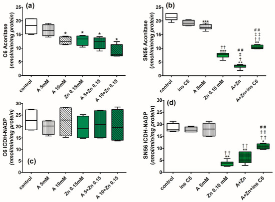 Zn also inhibited aconitase activity by the displacement of Fe2+ from its active centre [17]. The inhibition of aconitase by Zn in C6 was weaker than in SN56 cells, which may be an additional factor contributing to the higher susceptibility of neuronal cells to Zn excess (Table 1, Figure 9e). The strong inhibition of ICDH-NADP by Zn may be an additional complementary factor hampering only SN56 viability. On the other hand, the lack of ICDH-NADP activity inhibition by Zn in C6 cells may promote their resistance against the accumulation of this cation (Figure 9f). This indicates that astroglial cells may retain their functional capacity in conditions harmful for neuronal cells.