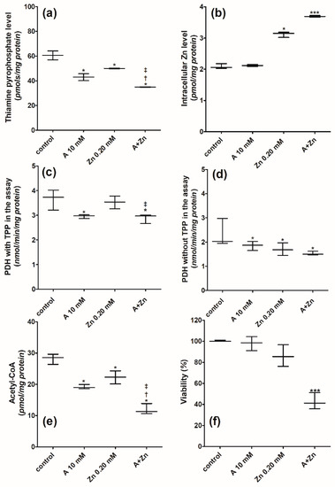 Blinding procedures were used as indicated: the cell culture and statistics were conducted by the experimenter; viability tests, the enzymes’ activities, acetyl-CoA, Zn, and TPP levels’ measurements were performed by different investigators working on randomized samples.