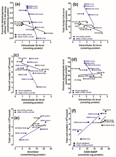 The correlations between (a) PDH activity assessed in assay medium without TPP against intracellular Zn content; (b) acetyl-CoA level against intracellular Zn content; (c) total cell number against intracellular Zn content; (d) TPP level against intracellular Zn content; (e) total cell number against aconitase activity, (f) total cell number against ICDH-NADP activity in C6 and SN56 cells cultured in thiamine-deficient medium. Data were taken from Figure 5, Figure 6 and Figure 7.