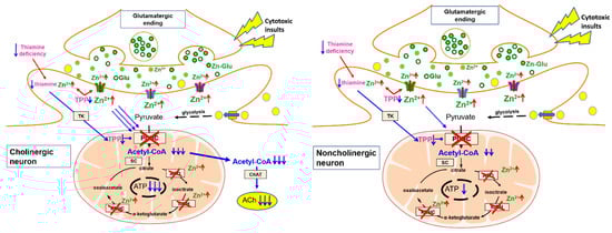 Pyruvate, the final product of the glycolytic pathway, is the main precursor of acetyl-CoA synthesized by a PDH-catalyzed reaction in mitochondria. Pathologic signals associated with AD and other cholinergic encephalopathies lead to prolonged depolarization of glutamatergic terminals and excessive release of glutamate and Zn. This causes an increased accumulation of zinc ions in postsynaptic neurons yielding direct inhibition of PDH activity. As a result, the synthesis of acetyl-CoA and its utilization in the TCA cycle are reduced. It leads to inhibition of ATP synthesis. In cholinergic neurons, the most significant fraction of the cytoplasmic acetyl-CoA pool is consumed for the synthesis of the acetylcholine. TPP deficits increase the permeability of plasma neuronal membranes for Zn leading to aggravation of its inhibitory effects on PDH and other enzymes of acetyl-CoA metabolism.