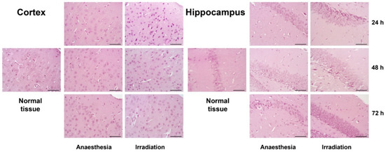 Haematoxylin-Eosin staining of the tissue samples did not reveal any significant changes in brain tissue morphology upon triple irradiation during the 24–72 h period (Figure 2).