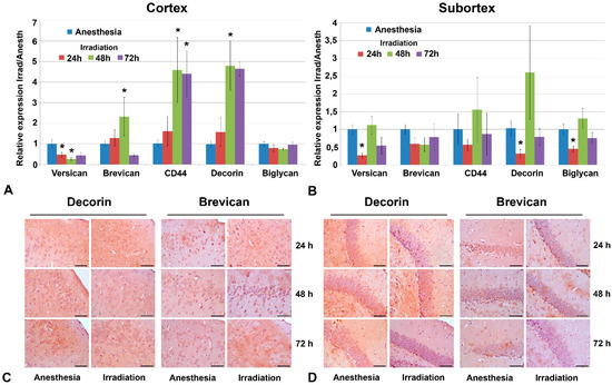 Expression levels of individual PGs in triple irradiated mouse brain tissue. (A,B) Real-time RT–PCR analysis, expression normalized to Gapdh, irradiated samples normalized to the appropriate control ones (anesthesia only). Bars represent the mean ± SD from triplicate experiments (OriginPro 8.5). ANOVA, a value of p < 0.05 was considered statistically significant (* p < 0.05). (C,D) Immunohistochemical staining for decorin and brevican core proteins. Magnification ×400, scale bar size 50 µm. PGs profiling and immunostaining were performed at 24, 48 and 72 h after irradiation.