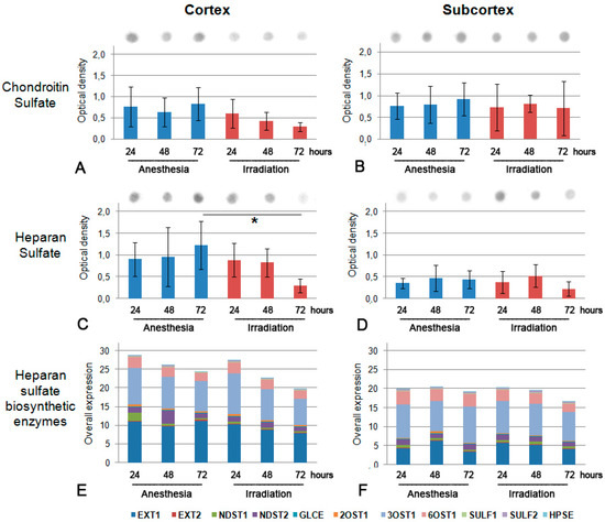 GAGs’ content in triple irradiated mouse brain tissue at 24, 48 and 72 h after irradiation. (A,B) CS content in cortex and subcortex structures (respectively). (C,D) HS content in cortex and subcortex structures (respectively). GAG content is normalized to total protein content, bars represent the mean ± SD from triplicate experiments (OriginPro 8.5). ANOVA, a value of p < 0.05 was considered statistically significant (* p < 0.05). (E,F) Overall transcriptional activity of the HS biosynthetic system in triple irradiated mouse brain tissue. The intensity of the amplified DNA fragments of HS biosynthesis-related genes was normalized to that of Gapdh. The stacked columns reflect the contribution of each gene to the total expression level based on the mean expression levels from triplicate experiments (Origin 8.5). Control—anesthetized animals.