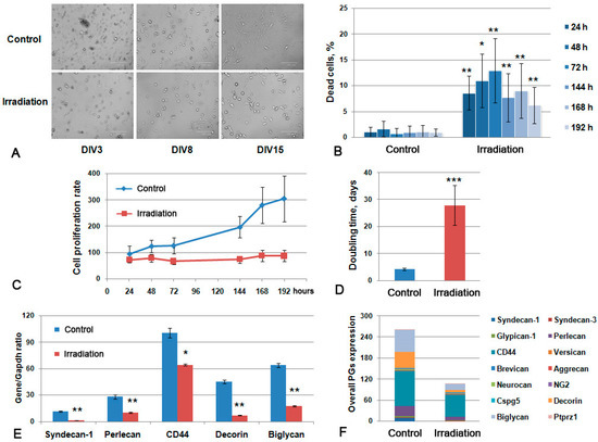 Primary glial culture from irradiated mouse brains. (A) Microphotograph of the obtained control and irradiated primary cultures at different Days-In-Vitro (DIV3-15). Bright-field microscopy, magnification ×200, scale bar 100 µm. (B) Viability of the cultures during the 24–192 h time period. (C) Growth curve of the primary glial cells. (D). Doubling time for the studied primary glial cells. Data presented on the B-D panels are obtained with the IN Cell Analyzer 2200 system. (E) PGs’ expression in glial primary cultures. Real-time RT–PCR analysis, intensity of the amplified DNA fragments normalized to that of Gapdh, bars represent the mean ± SD from triplicate experiments, ANOVA (OriginPro 8.5). (F) Overall transcriptional activity of PG core protein-coding genes in primary cultures from control and irradiated mouse brains. The stacked columns compare the contribution of each value to a total across categories. ANOVA, a value of p < 0.05 was considered statistically significant (* p < 0.05, ** p < 0.01, *** p < 0.001).