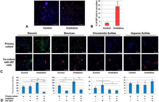 Overall, the obtained results demonstrate a significant increase in the ability of U87 GBM cells to adhere and proliferate on the primary glial cultures obtained in vitro from the triple-irradiated mouse brain compared to the control ones. Irradiation and co-culture with U87 cells resulted in complex deterioration of decorin and brevican core proteins’ expression and the contents of the polysaccharide chains of CS but not HS.