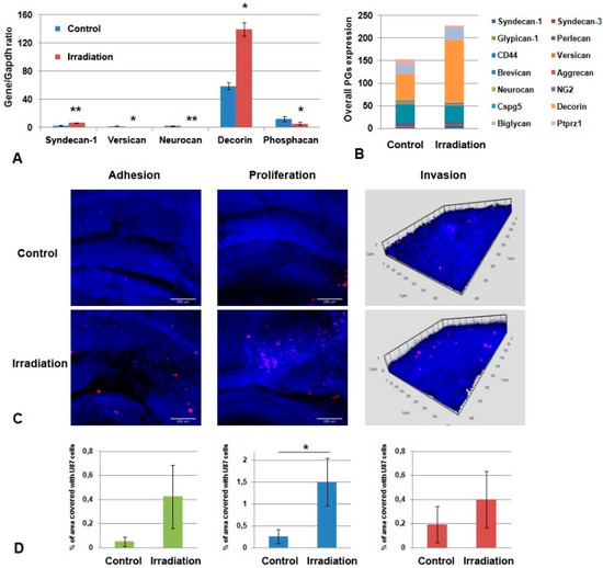 To investigate the functional contribution of ECM to the irradiation effects on brain tissue, organotypic brain slices were obtained from control and irradiated brains (experimental system with preserved ECM called ex vivo [39]), characterized for PGs’ expression and co-cultured with U87 cells. The irradiated organotypic brain slices were characterized by a significant increase in the mRNA levels of some PG core proteins (syndecan-1 and decorin, 2-fold) (Figure 7A) and elevated overall transcriptional activity of the main PGs (Figure 7B).