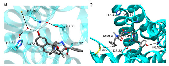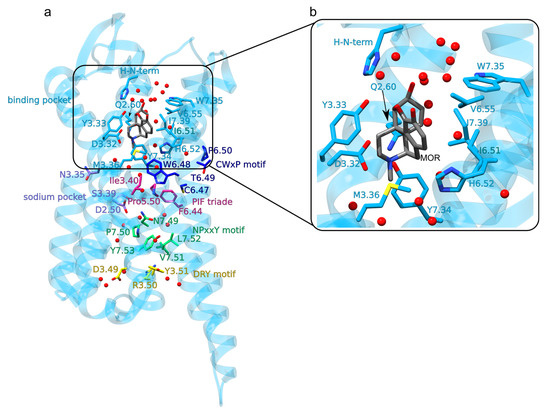 - Shim, J.; Coop, A.; MacKerell, A.D. Molecular Details of the Activation of the μ Opioid Receptor. J. Phys. Chem. B 2013, 117, 7907–7917. [Google Scholar] [CrossRef] [PubMed][Green Version]