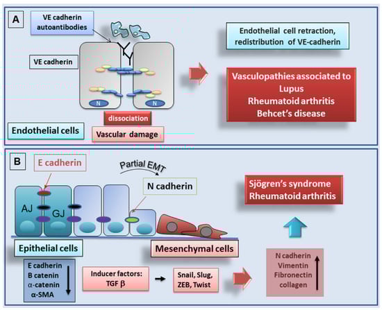 (A): potential pathogenic effect of anti-VE cadherin autoantibodies produced in the course of autoimmune diseases. Anti-VE cadherin autoantibodies, by destabilizing endothelial cell-cell interactions, induce increased vascular permeability thereby facilitating leukocyte recruitment and vascular damage. (B): schematic representation of the EMT process in rheumatoid arthritis and Sjögren’s syndrome. (AJ, adherens junction; GJ, gap junction).