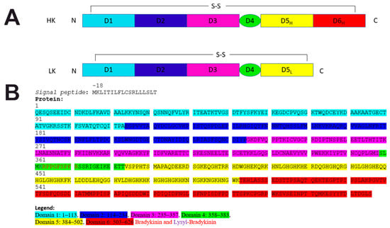 (A) Human plasma kininogen showing alternative splicing products of KNG1 gene messenger RNA–HK and LK. Both forms of protein have similar D1, D2, D3, and D4 domains, but different D5 domains. Domain 6 is absent in LK and the molecular weight of this form is lower than that of HK. (B) Human HK amino acid sequence according to UniProt P01042 with the indication of domains. N-terminus and C-terminus marked by corresponding letters. Disulfide (SS) bonds between the respective domains are marked.
