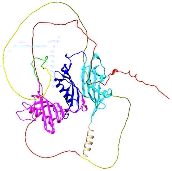 The failure to publish the structure of HK may be due to the difficulty of its crystallization even in parts and inability to use the NMR technique, as the protein is too large. Unfortunately, all classic structure prediction methods, based on homology, threading, and de novo (ab initio), have failed. In the first two cases, it was due to the lack of appropriate, similar enough templates, and in the last, it was due to the huge size of this protein. Using new tools such as AlphaFold Protein Structure Database, a structure for HK by DeepMind calculations de novo (https://www.alphafold.ebi.ac.uk/entry/P01042, accessed on 19 October 2021) could be predicted (Figure 3) [46,47,48,49]. Unfortunately, despite the solution of cystatin domains (D1–D3) with good model confidence, the other domains of the protein have very low confidence and appear as almost unfolded floating chains, and no glycans were present (Figure 3).