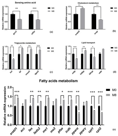 M. Albus between the M0 (0 g/kg) and M8 (8 g/kg) groups. To further explain the reasons why methionine deficiency affects the lipid metabolism of
