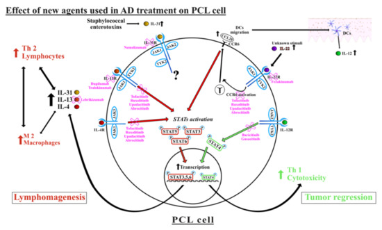 The further parts of the JAK/STAT pathway, especially STAT3, STAT5, and STAT6 also play the established role of mediators in the PCLs oncogenesis [101,157,173,175]. These proteins act upon the regulation of several gene transcriptions after being phosphorylated by JAKs. One study demonstrated the constitutive activation of STAT5 in CTCL; however, in most cases, after blocking the specific Janus kinase, these molecules should not be able to maintain their function in regulating different gene transcriptions [134,135]. Currently, there are no ongoing and upcoming trials concerning AD and STATs inhibition. Therefore, the STATs role in PCLs is beyond the scope of this review.