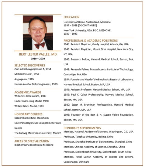 - Adelstein, S.J.; Riordan, J.F. Bert Vallee (1919–2010): A Biographical Memoir; National Academy of Sciences: Washington, DC, USA, 2014. [Google Scholar]