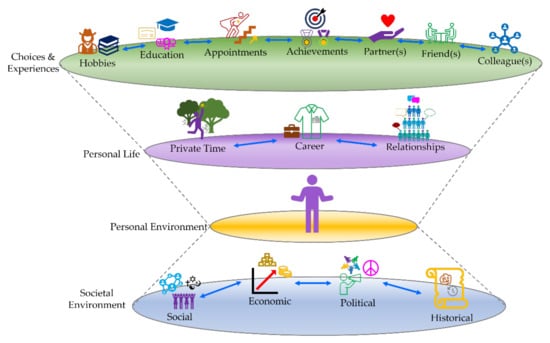 The placing-on-stage (mise-en-scène) of the individual. The bottom layer represents the Societal Environment, which is a result of the interaction of social, economic, political, and historical factors. The next layer, Personal Environment, is the societal environment filtered by the personal particularities of the actor. The Personal Life layer depicts the outcomes of the actor engaging with her/his personal environment distinguished by the different roles one plays. The upper layer, Choices and Experiences, are moments that shape us and make us who we are. There is a feedback mechanism between the different layers of the model represented by the dotted grey lines.