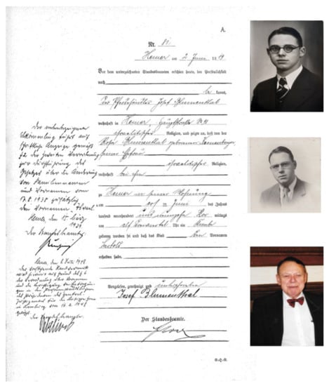 Bert Vallee was born as Bertold Blumenthal in the small town of Hemer, not far from Iserlohn, in what is today the German State of North Rhine Westphalia, on the 1st of June 1919, just four weeks before the signing of the Treaty of Versailles, which officially marked the end of the First World War (Figure 3, birth certificate). His father, Josef Blumenthal (1882–1958), was a descendent of a respected family of horse traders, whose long and fruitful history in Hemer can be traced to the 18th century, together with their stud farm and many relatives in town. His mother, Rosa, née Kronenberger, was not from Hemer. She was born in 1879 in the small village of Hoppstädten near Birkenfeld, today in the State of Rhineland-Palatinate. Besides Bertold, the couple had another son, Kurt Ziegbert, born in 1913 and father of a niece, Yona Kates, in Israel, and a nephew, Richard Bert Vallee, a professor at Columbia University in New York City. Bertold spent his youth in Hemer, attending school and subsequently the Gymnasium (High School or Secondary School) in nearby Iserlohn. The oral history of Hemer still bears memory of Bertold as a very intelligent and popular young boy.