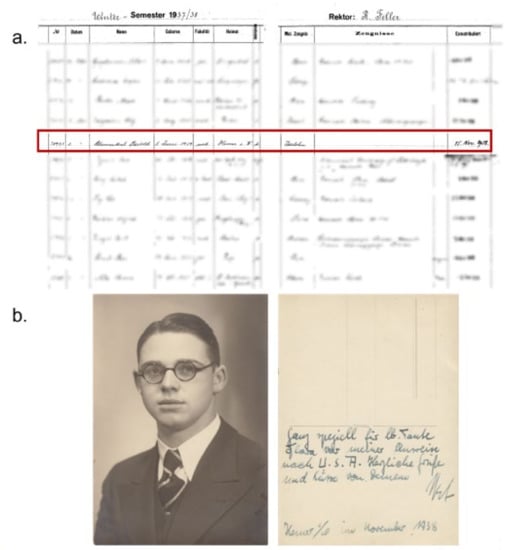On the 15th of November 1938, less than one week after the Kristallnacht pogrom, Bertold ex-matriculated from the University of Berne (Figure 4a). Just days later, on the 17th of November, he obtained a U.S. visa issued in the southern German city of Stuttgart, which he had probably already applied for earlier. Notably, during this turbulent month in 1938, he sent a postcard from Hemer with his photo and wrote “…very specially for my lovely aunt Flora before my departure to the US” (Figure 4b). Interestingly, we shall meet this postcard and photo again soon.