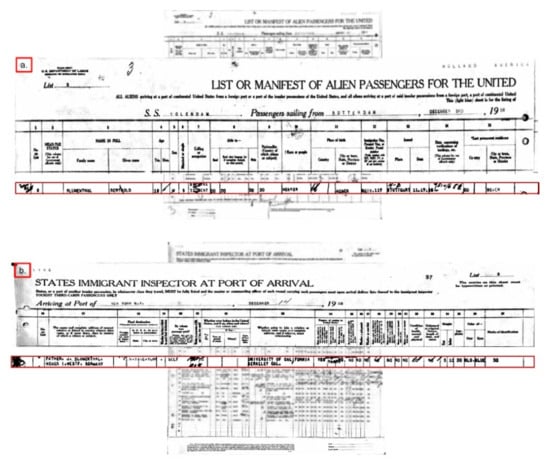 (a) boarding card and, (b) landing card of Bertold Blumenthal travelling from the Dutch city of Rotterdam to New York on board the SS Volendam in December 1938. Other names have been shaded purposively because of data protection concerns. (Photos adapted from www.ancestry.com, accessed on 8 December 2021).