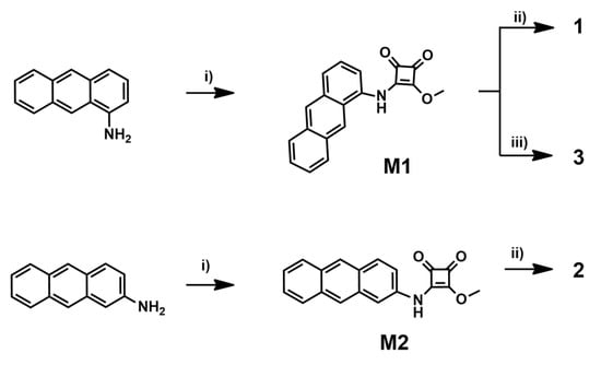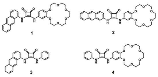 The synthesis of receptors comprised a two-step protocol relying on successive amidation of dimethyl squarate with 1-aminoanthracene for receptors 1, 3 and 2-aminoanthracene for receptor 2, followed by reaction of the obtained monoesters with 4-aminobenzo-18-crown-6 ether to give sensor 1 in 60% yield and receptor 2 in 70% yield. Finally, treatment of monoester M1 with aniline afforded the anion sensor 3 in 77% yield (Scheme 1).