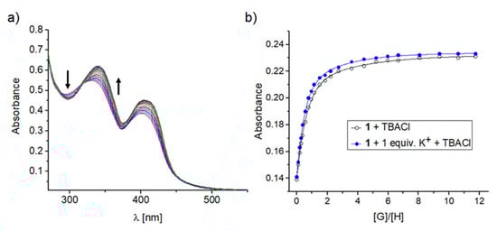 The binding affinities of receptors 1–4 for anion and ion pairs were evaluated using the UV–vis titration method in acetonitrile. By dilution experiments, we proved that in the investigated concentration range of 8 × 10−4 to 4 × 10−6 M the self-association of receptors does not take place. To verify the assumption that receptors 1, 2 and 4 are capable of binding ion pairs with significantly enhanced affinity relative to the monotopic receptor 3, selected titrations of receptors 1–4 with chloride anions (added as TBA salt) were performed in the presence and absence of cations (added as NaClO4 or KPF6). We have noticed a bathochromic shift in the UV–vis spectrum upon addition of incremental equivalents of salts to the receptor solutions as a result of complex formation (Figure 2).