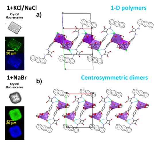 Image presenting fluorescence of the crystals of 1 with KCl/NaCl and 1 with NaBr salts, together with the molecular arrangements of moieties in the solid state: 1-D polymers in 1 + KCl/NaCl (a) and centrosymmetric dimmers in 1 + NaBr (b). All C-H hydrogen atoms omitted for clarity.