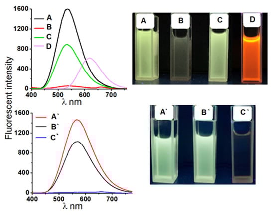 Top: Changes observed in the emission spectra of 1 in CH3CN (c = 1.05 × 10−4 M; excitation at 327 nm). A: receptor 1; B: upon addition of 100 equivalents of TBA2SO4; C: upon addition of 100 equivalents of TBACl; D: upon addition of 100 equivalents TBAF, and the corresponding changes seen after UV illumination (λ = 254 nm). Bottom: A’: receptor 1 (c = 1.01 × 10−4 M) in CH3CN; B’: upon addition of TBABr, TBACl, TBANO3 (33 equivalents each); C’: upon addition of TBABr, TBACl, TBANO3, TBA2SO4 (25 equivalents each), and the corresponding changes seen after UV illumination (λ = 254 nm).