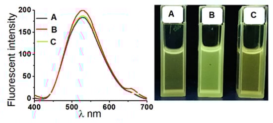 Fluorescence response of solution of receptor 1 (c = 2.3 mM) in CHCl3 (under UV light, λ = 254 nm). A: after contact with water; B: after extraction with aqueous K2SO4 (50 mM); C: after extraction with aqueous KCl (50 mM).