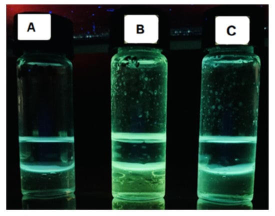 The initial increase in fluorescence in the wet solvent was attributed to the switching of the interaction of receptors with water molecules to the formation of complexes with salts, and this process was found to be more effective for sulfate salts. This was confirmed by 2D NMR measurements, which revealed the cessation of the signal attributed to exchange coupling with water molecules after the addition of salts to the solution of 1 together with a downfield shift of signals attributed to the squaramide protons (Supplementary Materials, Figure S50b). Analogous changes in fluorescence intensity of 1 were found in chloroform. This behaviour allowed for the construction of a unique two-phase fluorescent sensor utilizing the dual functions of the receptors, viz. their capacity for salt extraction and fluorescent visualization. Specifically, selective detection of sulfates in aqueous phase was achieved after contact with the solution of receptor 1 in chloroform, inducing “turn-on” fluorescence (Figure 6).