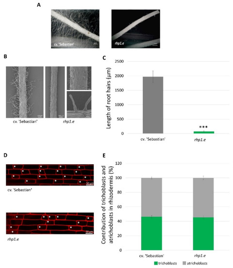 Root hair phenotype of WT cv. ‘Sebastian’ and rhp1.e mutant. (A) Light microscope and (B) SEM images of the root hair zone of WT and rhp1.e. (C) Length of the root hairs in the WT and mutant. Significant differences were calculated using Student’s t-test (*** p < 0.001). Graph shows mean of n = 500 root hairs per each genotype with SD. (D) Rhizodermis patterning in WT cv. ‘Sebastian’ and rhp1.e mutant. Optical sections through the rhizodermal layer and proportions of the two types of cell present in the root epidermis. Stars indicate trichoblasts. (E) Proportion of trichoblasts and atrichoblasts in rhizodermis of WT ‘Sebastian’ and rhp1.e mutant.