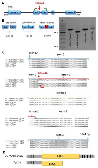 (A) The position of identified splice junction mutation in HvCSLC1 gene (red arrow). Green arrows indicate the location of primes used in PCR amplification of a region flanking the mutation. (B) PCR products spanning the part of exons 2 and 3 of HvCSLC1 sequence that were amplified using genomic DNA (gDNA) and cDNA as templates in cv. ‘Sebastian’ and rhp1.e mutant. (C) The alignment of a part of the HvCSLC1 genomic (1605 bp to 1844 bp) and cDNA sequences representing fragment of exon 2, intron 2 and fragment of exon 3 of cv. ‘Sebastian’ and rhp1.e mutant. Red arrow indicates a splice junction mutation at the donor splicing site, red frame shows the premature STOP codon in the rhp1.e cDNA sequence. (D) The scheme represents the full length HvCSLC1 protein in the WT and the shorter protein with the lost part of amino acid sequence as a result of mutation in the rhp1.e mutant. Black boxes indicate location of transmembrane domains (TDMs); CESA—cellulose synthase domain.