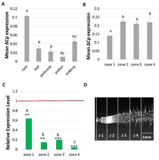 Expression profile of HvCSLC1 gene in (A) various organs and (B) four root zones of WT cv. ‘Sebastian’. (C) Relative expression level of HvCSLC1 in four root zones of rhp1.e mutant normalized to the gene expression in the corresponding zone of WT, which was considered as the value 1 (red line). Root zones: 1—meristematic, 2—elongation, 3—differentiation and 4—developed root hair zone. Different lowercase letters indicate the significant differences between analyzed organs (A) and root zones (B) of the WT ‘Sebastian’ and root zones of rhp1.e mutant (C) according to the One Way ANOVA, Tukey’s HSD test (p < 0.05). Asterisks indicate the significant differences between the mutant and WT parent according to the Student’s t test (*** p < 0.001; ** p < 0.01). Graph shows mean values of n = 3 with SEM. (D) Root zones that were used for analysis of gene expression (based on Kwasniewski et al., 2010 [47]).