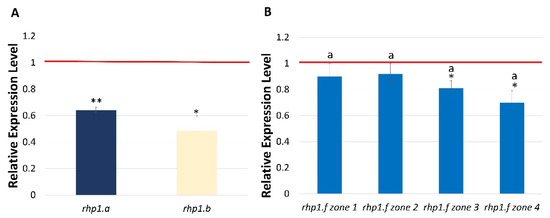 Expression profile of HvCSLC1 gene in allelic rhp1 mutants: (A) in roots of rhp1.a and rhp1.b and (B) in four root zones of rhp1.f, normalized to the expression level in the corresponding organs/root zones of WT, which was considered as the value 1 (red line). Root zones: 1—meristematic, 2—elongation, 3—differentiation and 4—developed root hair zone. Different lowercase letters indicate the significant differences between analyzed root zones of rhp1.f mutant according to the one way ANOVA, Tukey’s HSD test (p < 0.05). Asterisks indicate the significant differences between mutant and parent variety according to the Student’ t-test (** p < 0.01; * p < 0.05). Graphs show mean values of n = 3 with SEM.