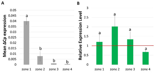 Expression profile of HvCSLC3 gene in (A) four root zones of WT cv. ‘Sebastian’ (B) four root zones of rhp1.e mutant normalized to the gene expression level in the corresponding zones of WT, which was considered as the value 1 (red line). Root zones: 1—meristematic, 2—elongation, 3—differentiation and 4—developed root hair zone. Different lowercase letters indicate the significant differences between analyzed root zones in WT (A) and mutant (B) according to the one way ANOVA, Tukey’s HSD test (p < 0.05). Graph shows mean values of n = 3 with SEM.