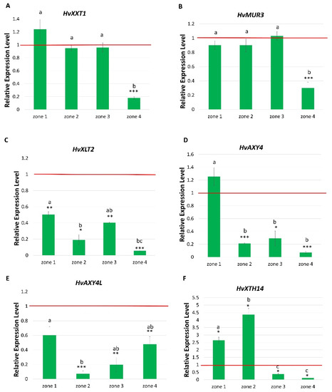 Expression profile of genes potentially involved in XyG synthesis in barley within four root zones of rhp1.e mutant. Relative expression level of each gene was normalized to the expression in the corresponding zones of the WT, which was considered as the value 1 (red line). (A) HvXXT1, (B) HvMUR3, (C) HvXLT2, (D) HvAXY4, (E) HvAXY4L, (F) HvXTH14. Root zones: 1—meristematic, 2—elongation, 3—differentiation and 4—developed root hair zone. Different lowercase letters indicate the significant differences between analyzed root zones in mutant according to the one way ANOVA, Tukey’s HSD test (p < 0.05). Asterisks indicate the significant differences between the mutant and parent variety according to the Student’s t-test (*** p < 0.001; ** p < 0.01; * p < 0.05). Graph shows mean values of n = 3 with SEM.