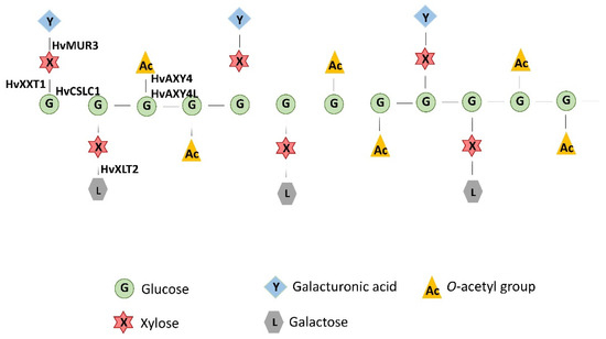 The scheme of XyG type occurring in barley root hair during tube elongation and the proteins potentially involved in its synthesis. HvCSLC1—cellulose synthase-like C1, HvXXT1—xyloglucan 6-xylosyltransferase, HvMUR3, HvXLT2—galactosyltransferases, HvAXY4—altered xyloglucan 4, HvAXY4L—altered xyloglucan 4-like.