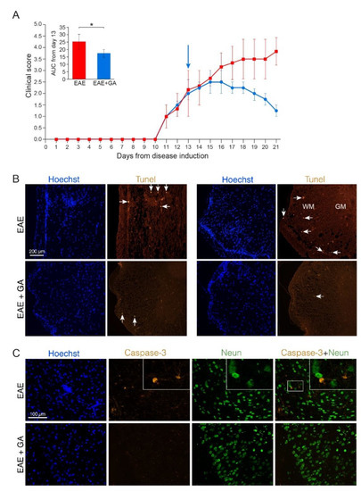 Apoptotic cell death in EAE induced mice, 21 days after disease induction, and the effect of GA-treatment. (A) Clinical scores of MOG-induced mice and GA-treated mice, treatment initiated at day 13. Average daily clinical scores ± SEM are presented for five mice per group. Insert is the area under curve (AUC) for days 13–21 ± SEM. Arrow indicates initiation of GA-injection period. * p < 0.05. (B) Tunel labeling in the spinal cord. Examples from two EAE-untreated and two EAE+GA mice are shown. In the white matter (WM), but not in gray matter (GM) of EAE-untreated mice, Tunel positive cells are detected in sites of cell infiltrations (indicated by Hoechst staining), whereas in GA-treated mice, less inflammation and less Tunel positive cells are seen. Arrows indicate examples of positive Tunel staining. (C) Caspase-3 staining in the brain. Caspase-3 positive cells, negative for NeuN are detected in the cortex of EAE-untreated mice. In GA-treated mice less Caspase-3 positive cells are seen.