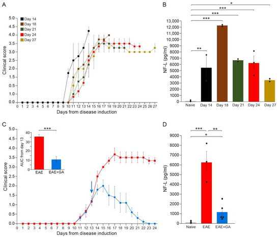 The kinetics of NFL leakage in sera of EAE-mice along the disease duration and the effect of GA-treatment. (A) Clinical daily scores of the EAE groups tested at different time-points after disease induction. (B) NFL concentration (pg/mL) in the serum of EAE-mice along the disease duration. (C) Clinical daily scores of EAE-untreated mice and the effect of GA daily suppression treatment, initiated at day 13. The insert is the area under curve (AUC) for days 13–24 ± SEM. Arrow indicates initiation of GA treatment. (D) NFL concentration (pg/mL) in the serum of EAE-untreated and GA-treated mice, 24 days after disease induction. The average values ± SEM for 2–5 mice (measured in duplicates for each mouse) are demonstrated. Values of individual mice are depicted by dots. NFL concentrations determined by single molecule array (Simoa). * p < 0.05, ** p < 0.01, ***, p < 0.001.