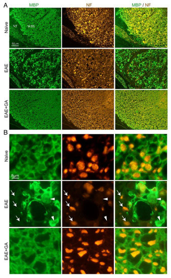 Immunohistological characteristics in spinal cords of EAE-induced mice, 24 days after disease induction and the effect of GA (suppression treatment). Myelin is visualized by anti-myelin basic protein (MBP) and axons by anti-neurofilament (NF). (A) Ventral lateral spinal cord area. (B) Inserts with higher magnifications. In EAE-untreated mice, sites of demyelination (arrows) and axonal loss (arrowheads) are revealed, whereas in GA-treated mice, damage to myelin and axons is less apparent. WM- CNS white matter, vr- ventral roots in the periphery.