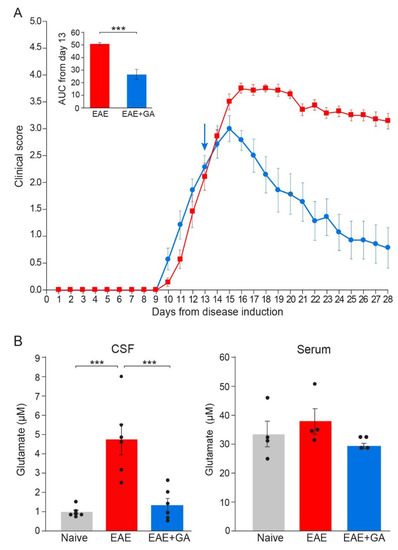 Glutamate levels in EAE-mice and the effect of GA-treatment. (A) Clinical scores of EAE mice and the effect of GA daily suppression treatment, initiated at day 13. The average daily clinical scores ± SEM are presented for six mice per group. The insert is the area under curve (AUC) for days 13–28 ± SEM. Arrow indicates initiation of GA treatment. (B) Glutamate concentrations (µM) in the cerebrospinal fluid (CSF, left), and in the periphery (serum right) of naïve, EAE-untreated, and EAE+GA mice, determined 28 days after disease induction, by mass spectrometry. The average concentration ± SEM of six mice per group for the CNS and four mice per group for the serum is shown. Values of individual mice are depicted by dots. *** p < 0.005.