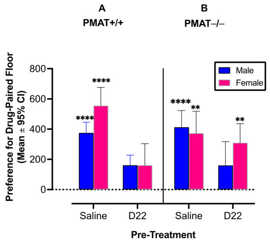 Decynium 22 (D22) prevents amphetamine-induced conditioned place preference (CPP) in plasma membrane monoamine transporter (PMAT) wild-type (+/+) male and female mice (A), and in male PMAT knockout (−/−) mice (B). Female PMAT−/− mice do not develop significant CPP for amphetamine. n = 16 per group. Error bars are 95% confidence intervals (CI). Asterisks indicate mean values with 95% CI that do not include zero, representing statistically significant place preference (male and female PMAT+/+ and female PMAT−/− mice). ** p < 0.01; **** p < 0.0001