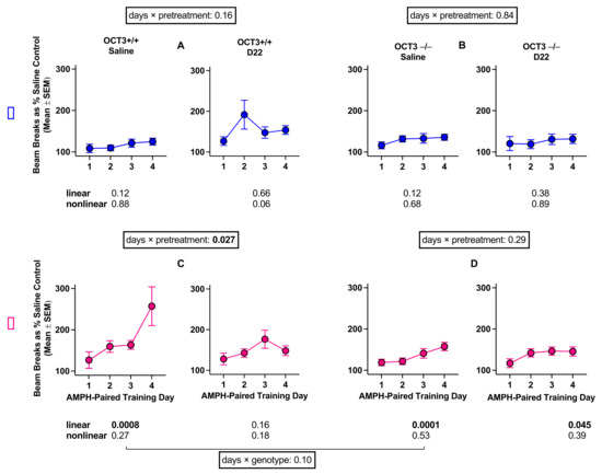 Sensitization to the locomotor stimulating effects of amphetamine (AMPH) in male (A,B) and female (C,D) organic cation transporter 3 (OCT3) wild-type (+/+) and OCT3 knockout (−/−) mice treated with saline or decynium 22 (D22) before amphetamine. Each part of the figure (A–D) shows the p value for the days by pretreatment interaction for each genotype and each sex. In addition, a p value is shown for the comparison of genotypes in saline-pretreated females. Additionally, each of the 8 panels (n = 16 mice per panel) shows p values for linear and nonlinear trends across days. Statistically significant p values are shown in bold.