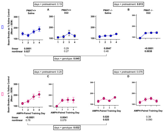 Sensitization to the locomotor stimulating effects of amphetamine (AMPH) in male (A,B) and female (C,D) PMAT+/+ and PMAT−/− mice treated with saline or decynium 22 (D22) before amphetamine. Each part of the figure (A–D) shows the p value for the days by pretreatment interaction for each genotype and each sex. In addition, a p value is shown for the comparison of genotypes in saline-pretreated males and females. Additionally, each of the 8 panels (n = 16 mice per panel) shows p values for linear and nonlinear trends across days. Statistically significant p values are shown in bold.