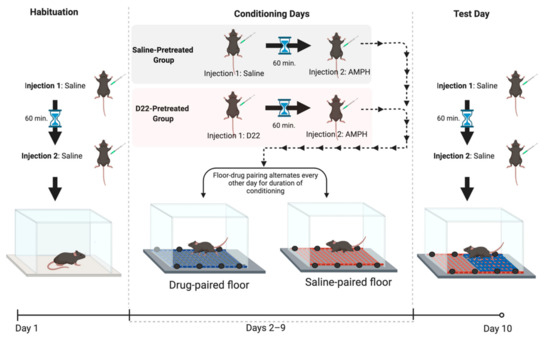 Conditioned Place Preference (CPP) in rodents, which is often used to model abuse-related drug effects, is shown by a preference for an environment previously paired with a drug compared with an environment previously paired with vehicle [70,71]. Conditioned place preference (CPP) and sensitization of locomotor activity were measured in the same animals using a procedure similar to that described previously [37]. All mice in the current experiments were exposed to the often used, unbiased, one-compartment place-conditioning procedure, with sessions conducted once per day [37,72]. To counterbalance tactile stimulus (floor type) and drug assignment (saline or D22 pretreatment), amphetamine was paired with the hole floor-texture and the vehicle with the grid floor-texture for half of the mice; pairings were opposite for the remaining mice. The CPP procedure consisted of three phases (Figure 5): habituation (one session), conditioning (eight sessions), and place preference test (one session). Immediately before each session, each animal received an intraperitoneal injection of saline or 0.1 mg/kg D22, followed 60 min later by a second injection of saline or 1 mg/kg amphetamine (n = 16 per treatment). After the second injection, mice were immediately placed in the center of the apparatus. Between tests, the floor and the inside of the boxes were wiped, and the litter paper beneath the floor was replaced. The habituation session was intended to reduce the novelty and stress associated with handling, injection, and exposure to the apparatus; thus, for this session, all mice received saline and were placed in the apparatus for 30 min on a floor covered with paper. The following 8 days, 30 min conditioning sessions were held. Conditioning consisted of pairing one floor type with the injection of amphetamine and the other floor type with the injection of saline. The day after the last conditioning session, the 30 min floor preference test was conducted in mice having received saline. The time spent on the amphetamine-paired floor was subtracted from the time spent on the saline-paired floor, and this difference was used to measure place preference. Previous reports [37,73] demonstrate that C57BL/6J control mice repeatedly treated with only saline spent the same amount of time on both floor types during preference tests, indicating no preference for one floor type over the other, and allowing for the use of an unbiased method to assess CPP. Sensitization to the locomotor stimulant effects of amphetamine, evidenced by progressively enhanced locomotor responses following repeated administration of amphetamine [51], was measured during the amphetamine conditioning sessions of the CPP procedure. All sessions were conducted once per day between the hours of 8 AM and 11 AM.