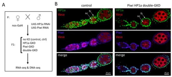 Generation of Piwi and HP1a separate and double-germline knockdowns. (A) Experimental design of the study. Control (no KD) flies and individuals with nos-GAL4-driven germline knockdowns (GKD) of Piwi and HP1a and the Piwi/HP1a double-GKD were obtained simultaneously from the same cross. (B) Control and double-GKD ovarioles immunostained for HP1a (green), Piwi (purple) and germ cell marker Vasa (red). Examples of germline nurse cells and somatic follicle cells are indicated as “nc” and “fc”, respectively.