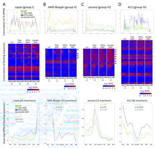 Among the group III TEs, the element most widely represented in euchromatin was aurora (12 insertions). Consistent with the regulation of this TE (Figure 3C, upper panel), the transcription of the flanking regions for seven aurora insertions was higher upon double-GKD than upon single knockdowns (Figure 3C, middle panel). Accordingly, the averaged effect of upregulation at the flanking regions over all aurora insertions was significant only for double-GKD (Mann–Whitney test, p = 0.039) (Figure 3C, bottom panel). Piwi-independent regulation, characteristic for group IV TEs, can be exemplified by insertions of the 412 element, whereas the transcriptional spreading upon Piwi-GKD was also observed for several 412 insertions (Figure 3D).