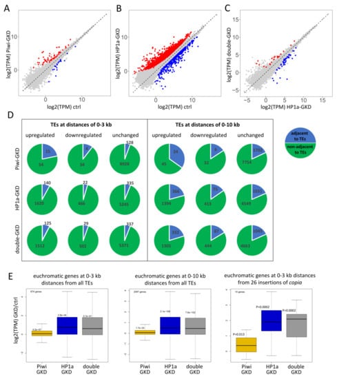 Next, we evaluated whether the differentially expressed euchromatic genes are located close to insertions of TEs. We found that most upregulated and downregulated euchromatic genes upon all the three knockdowns, and especially upon HP1a-GKD and double-GKD, are not adjacent to TEs at least at a distance of up to 10 kb (Figure 5D and Table S5). These results indicate that the observed changes in gene expression upon HP1a loss are mostly not associated with the regulation of TEs. The molecular mechanisms by which HP1a and other components of heterochromatin can affect many euchromatic genes independently of TEs are discussed in a number of works [,,,,] but generally remain unclear (see Section 3). Nevertheless, we suppose that a minority of genes can be upregulated due to the abolishment of repressive chromatin spreading from TE insertions. This is supported by the fact that the proportion of genes residing near TE insertions is noticeably higher for the upregulated genes than for the downregulated ones and genes with unchanged expression (Figure 5D and Table S5). This effect was observed upon all three knockdowns but was most pronounced for Piwi-GKD.